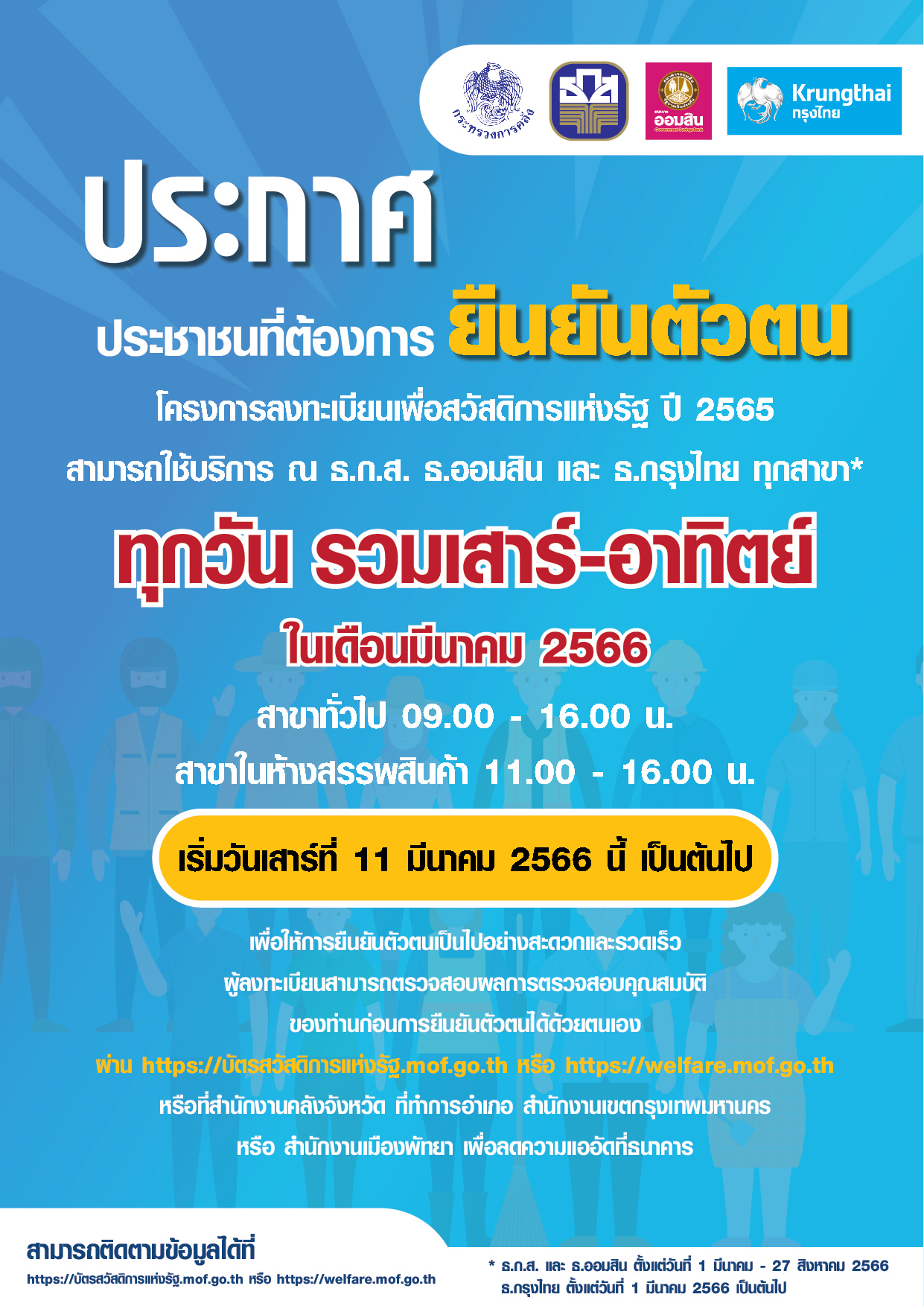 แถลงข่าว กค. ฉบับที่ 42/2566 เรื่อง การเปิดบัญชีของผู้ได้รับสิทธิตามโครงการลงทะเบียนเพื่อสวัสดิการแห่งรัฐ ปี 2565 และการเปิดรับลงทะเบียนมาตรการบรรเทาภาระค่าไฟฟ้าและค่าน้ำประปา ลงวันที่ 10 มีนาคม 2566