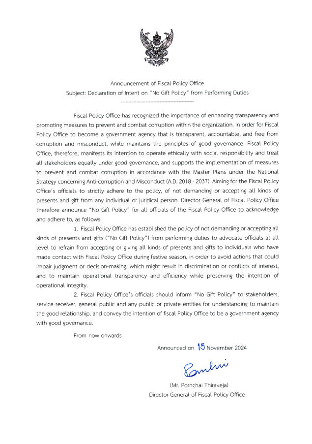 ประกาศนโยบาย No Gift Policy จากการปฏิบัติหน้าที่ ของ สศค.ปี 2568 ฉบับภาษาอังกฤษ