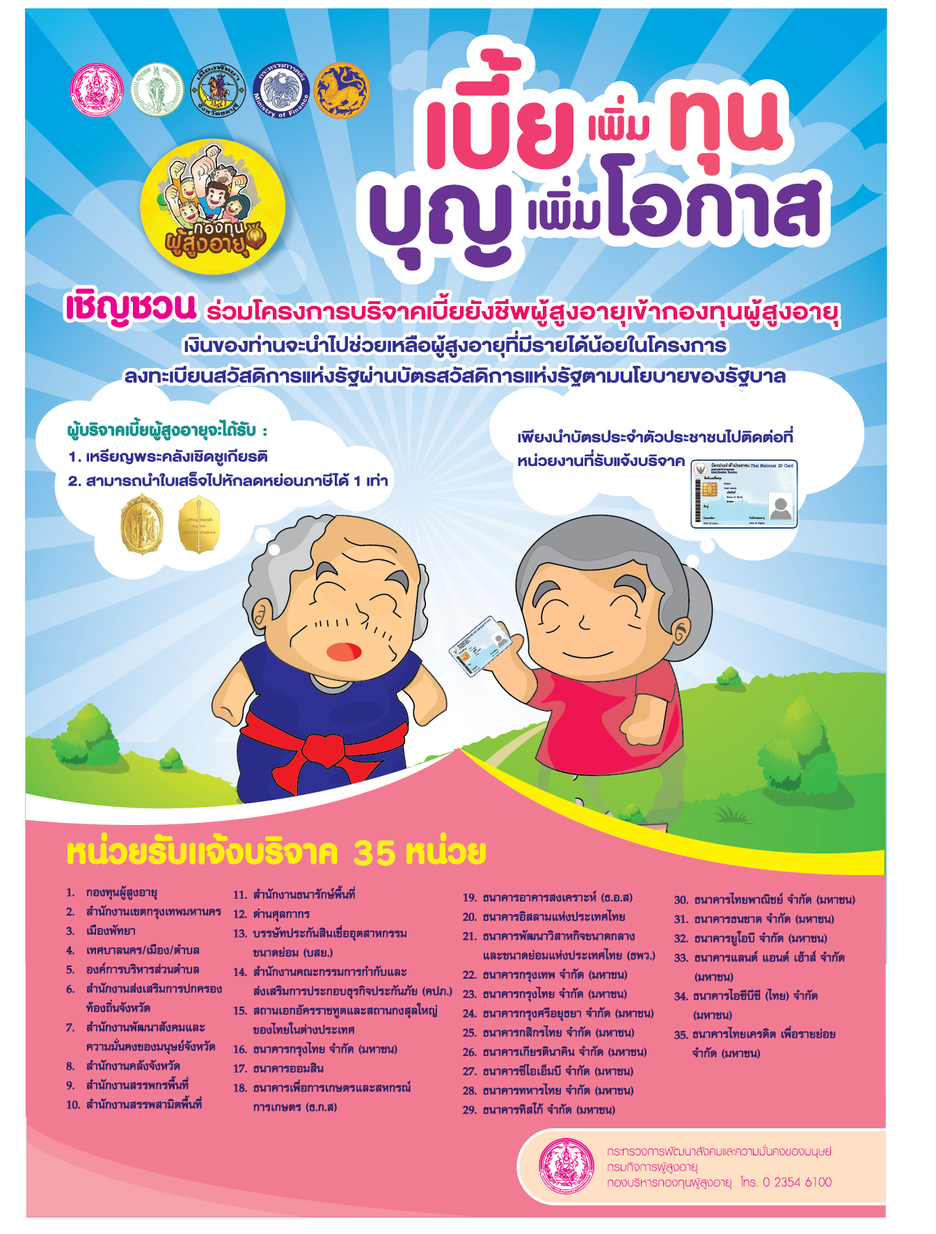 โครงการบริจาคเบี้ยยังชีพผู้สูงอายุเข้ากองทุนผู้สูงอายุ เพื่อให้เงินช่วยเหลือผู้สูงอายุที่มีรายได้น้อ