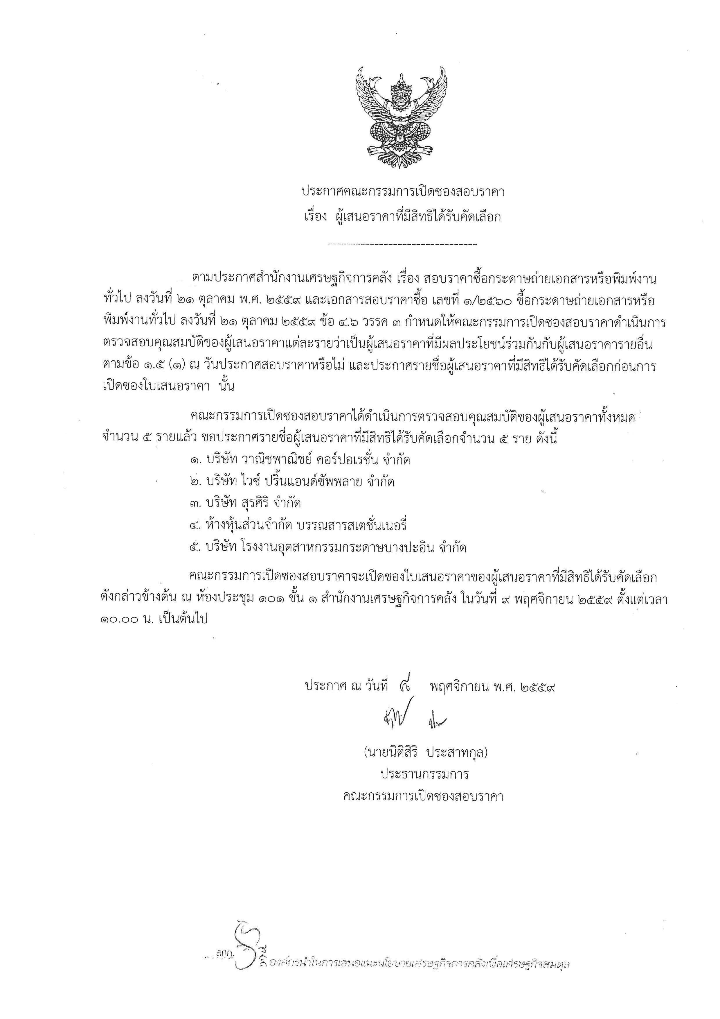 ประกาศคณะกรรมการเปิดซองสอบราคา เรื่อง ผู้เสนอราคาที่มีสิทธิได้รับคัดเลือก