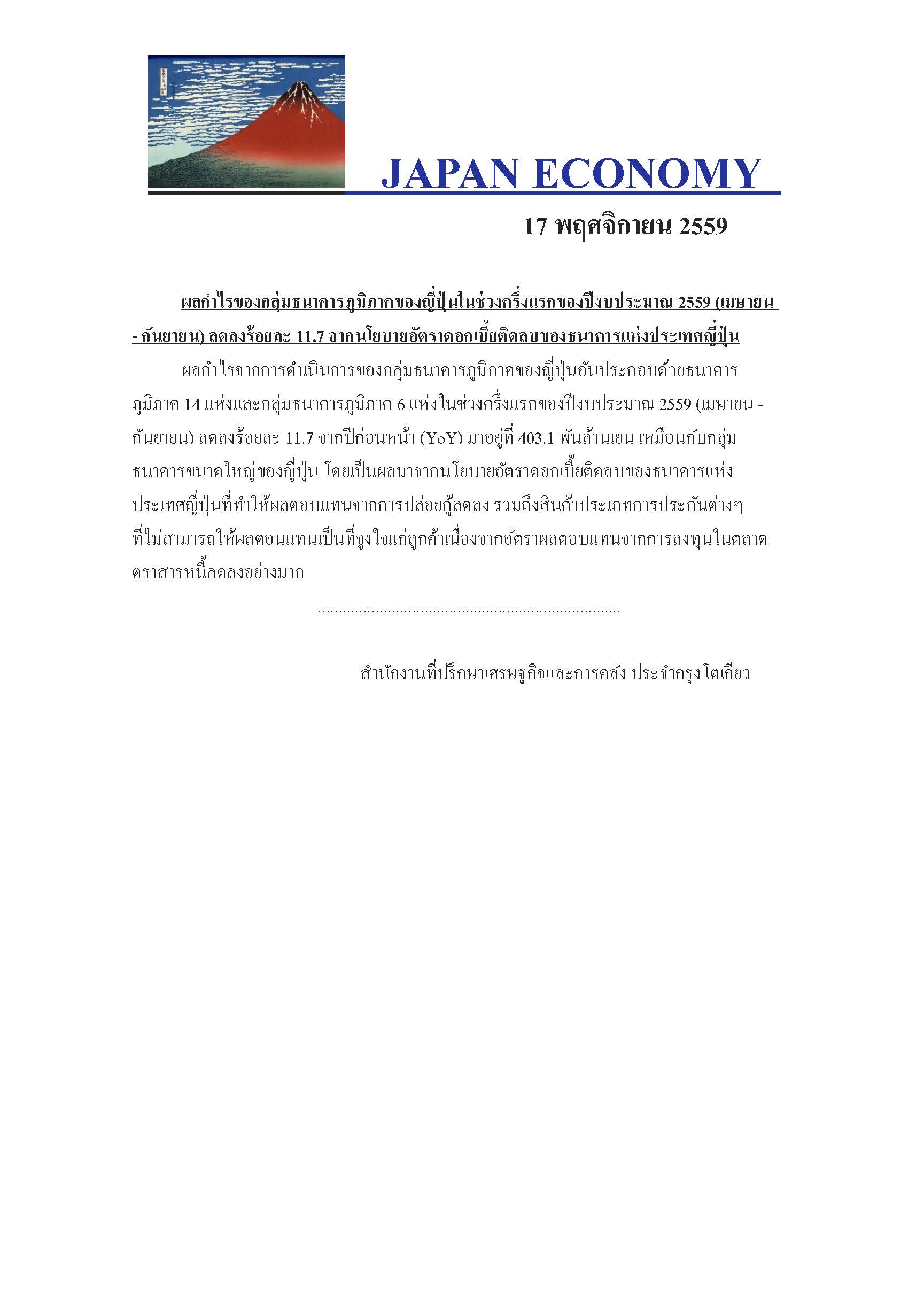 รายงานภาวะเศรษฐกิจญี่ปุ่น ประจำวันที่ 17 พ.ย. 59