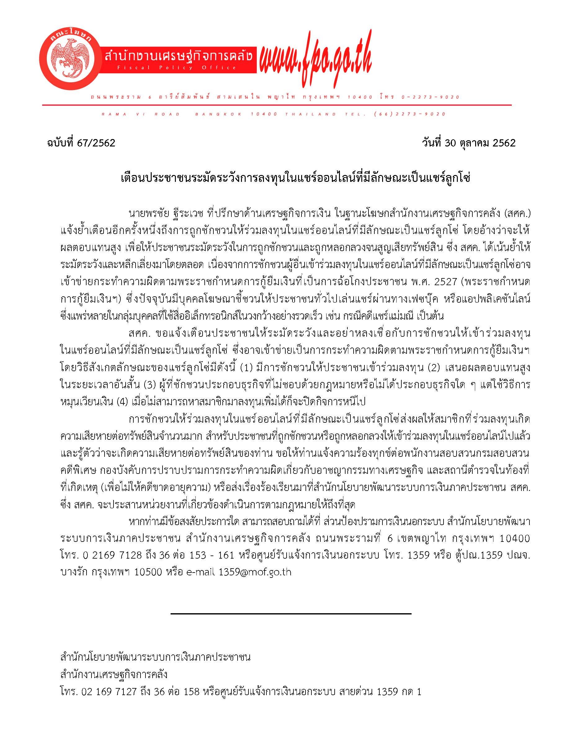 แถลงข่าว สศค. ฉบับที่ 67/2562 เรื่อง เตือนประชาชนระมัดระวังการลงทุนในแชร์ออนไลน์ที่มีลักษณะเป็นแชร์ลูกโซ่