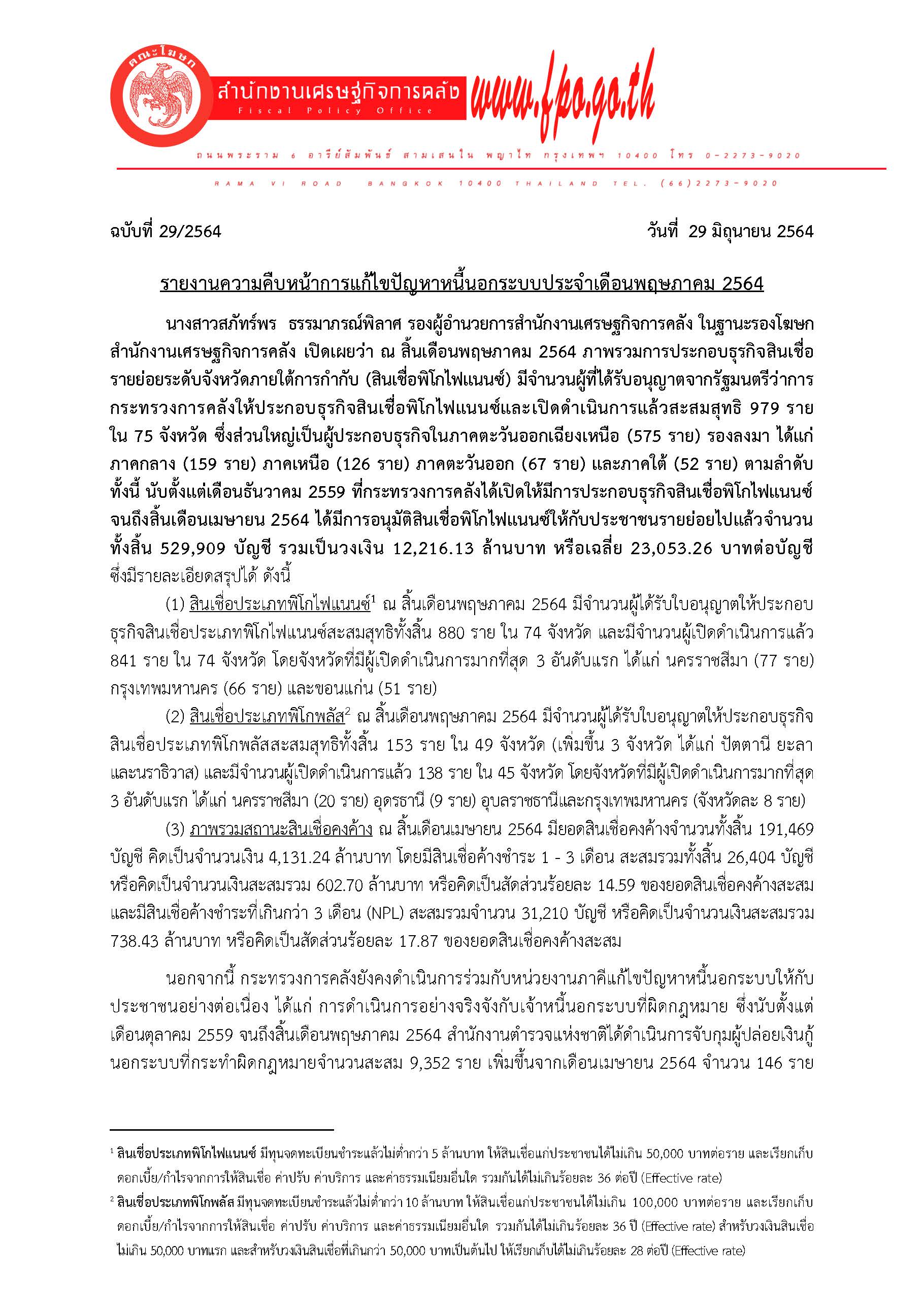 แถลงข่าว สศค. ฉบับที่ 29/2564 เรื่อง รายงานความคืบหน้าการแก้ไขปัญหาหนี้นอกระบบประจำเดือนพฤษภาคม 2564