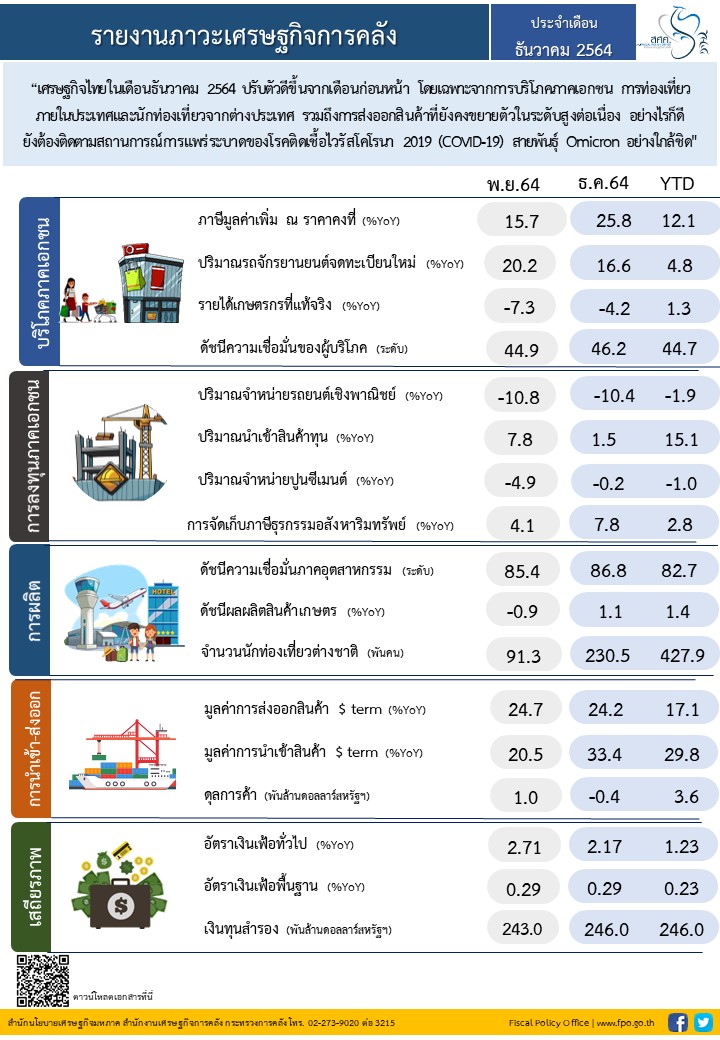 แถลงข่าว สศค. ฉบับที่ 3/2565 เรื่อง ภาวะเศรษฐกิจการคลังประจำเดือนธันวาคม 2564