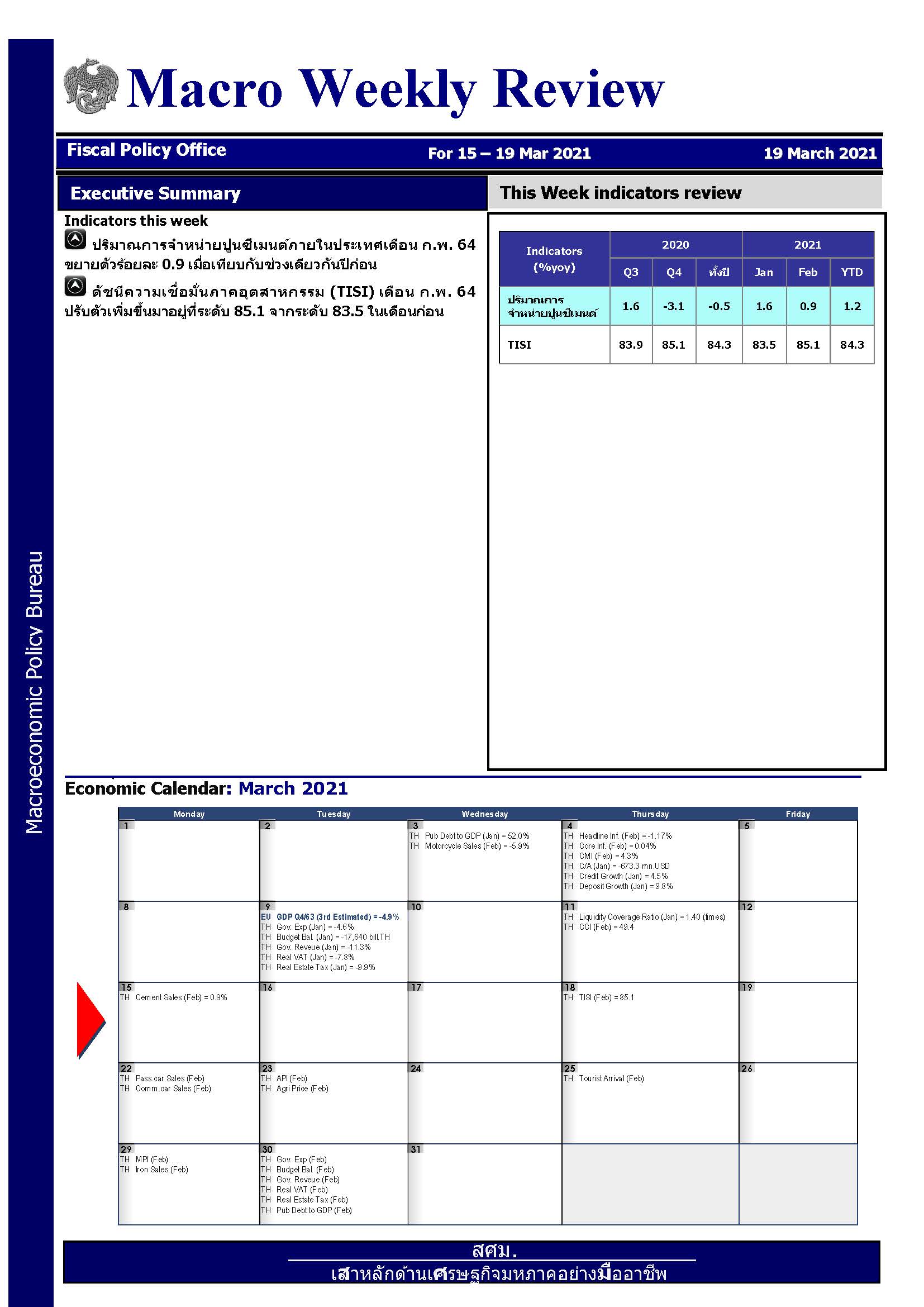 รายงานภาวะเศรษฐกิจประจำวันที่ 15 มี.ค. - 19 มี.ค. 2564