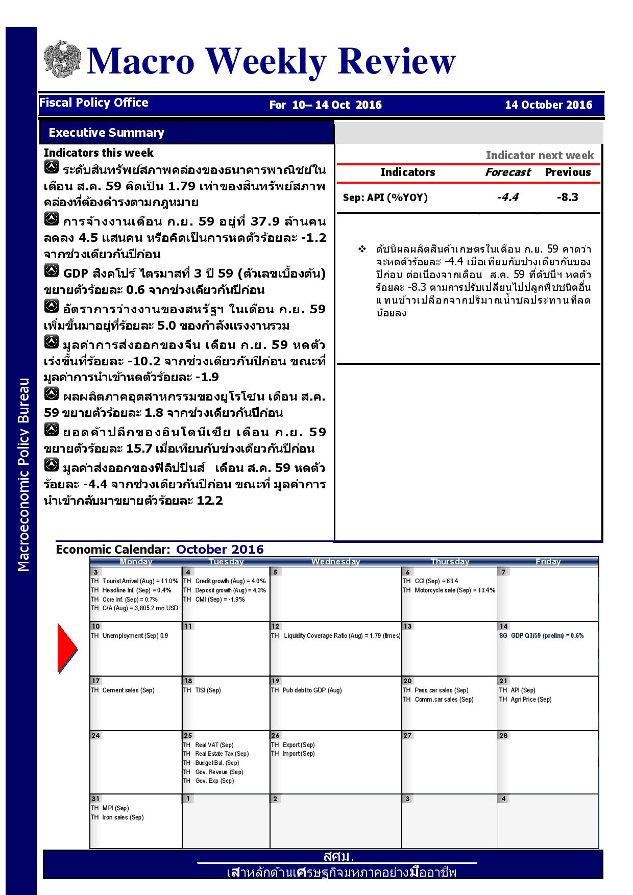 รายงานภาวะเศรษฐกิจประจำวันที่ 10 ต.ค. - 14 ต.ค. 59