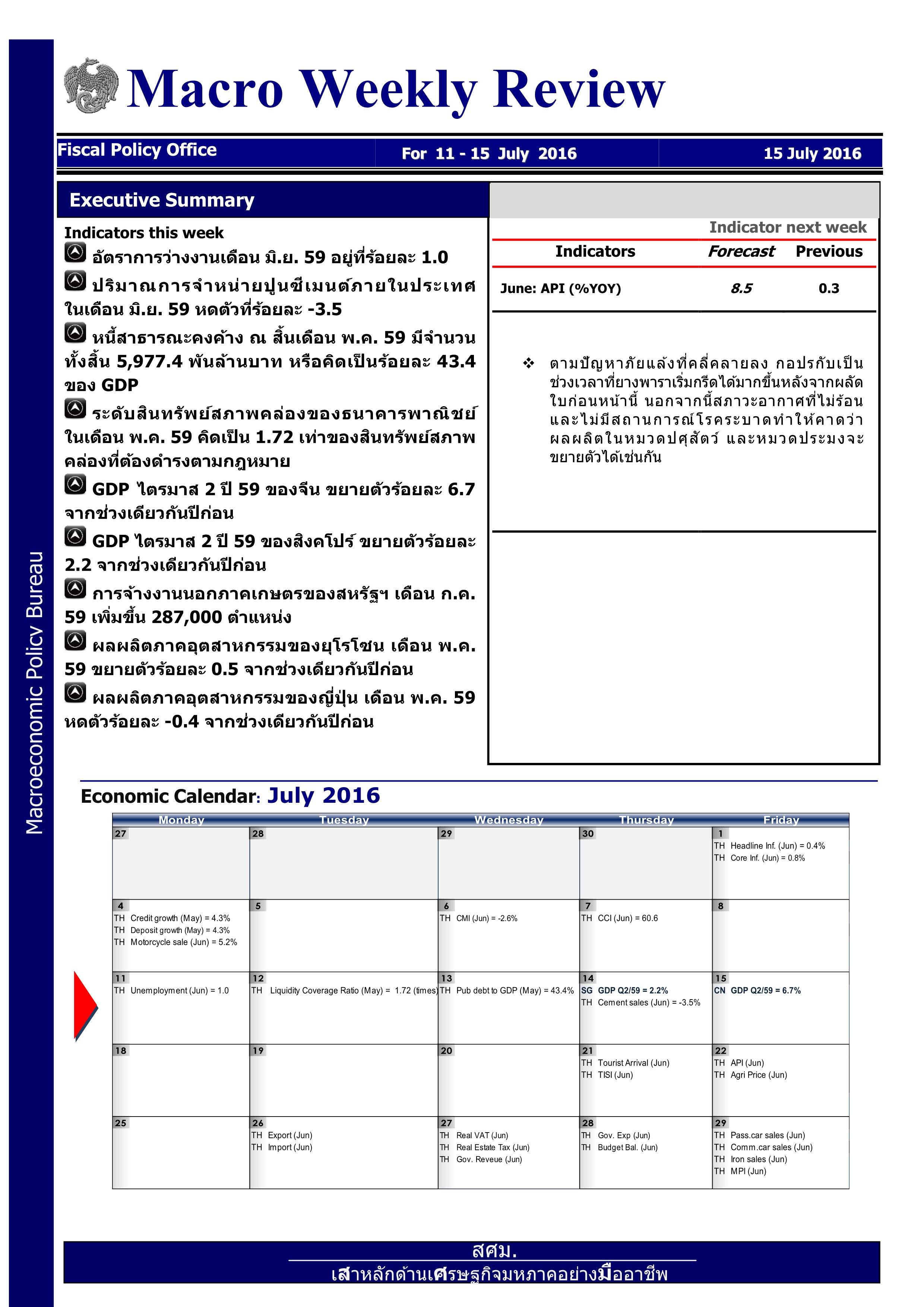 รายงานภาวะเศรษฐกิจประจำวันที่ 11 - 15 ก.ค. 59