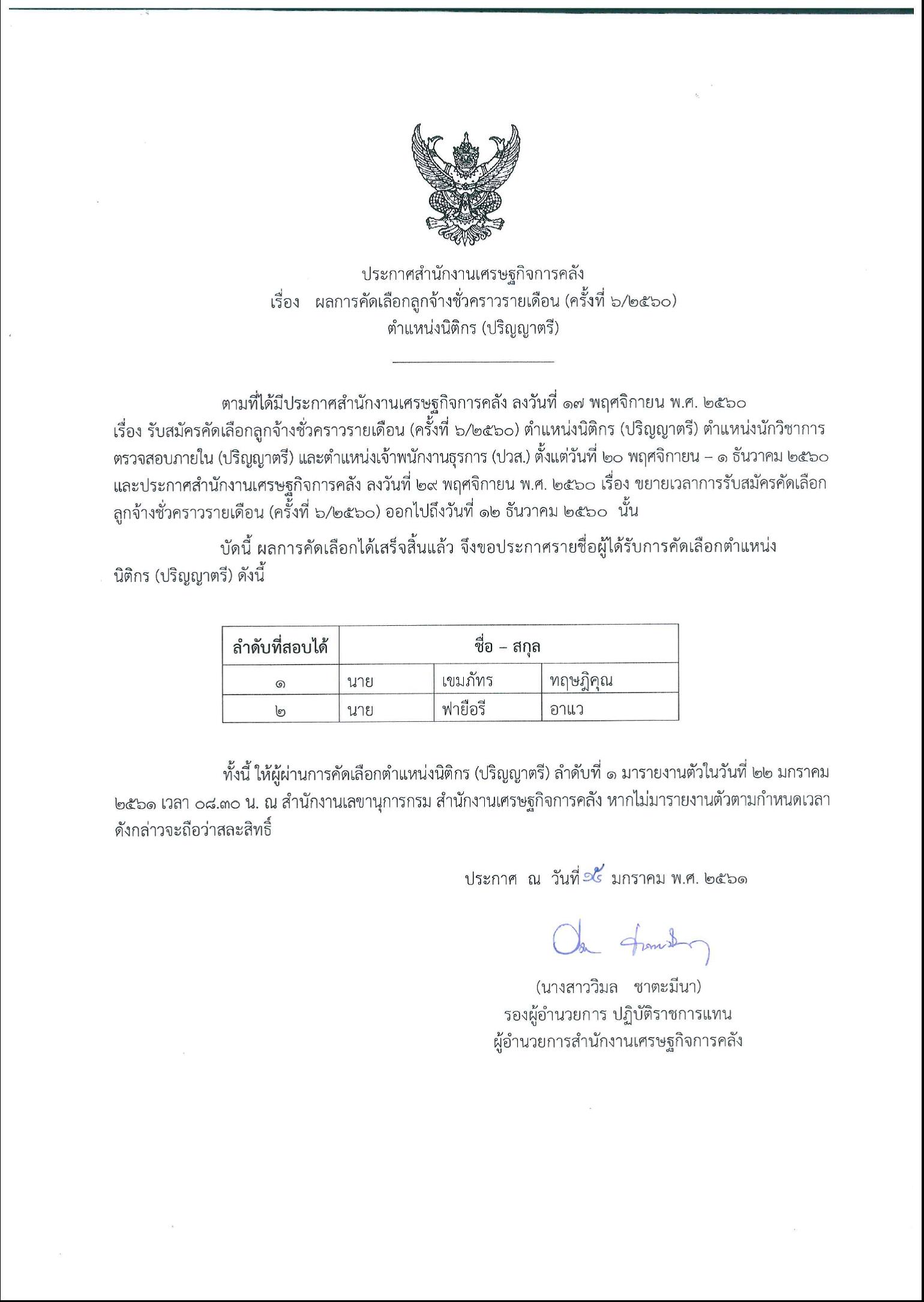ประกาศผลการคัดเลือกลูกจ้างชั่วคราวรายเดือน (ครั้งที่6/2560) ตำแหน่งนิติกร (ปริญญาตรี)