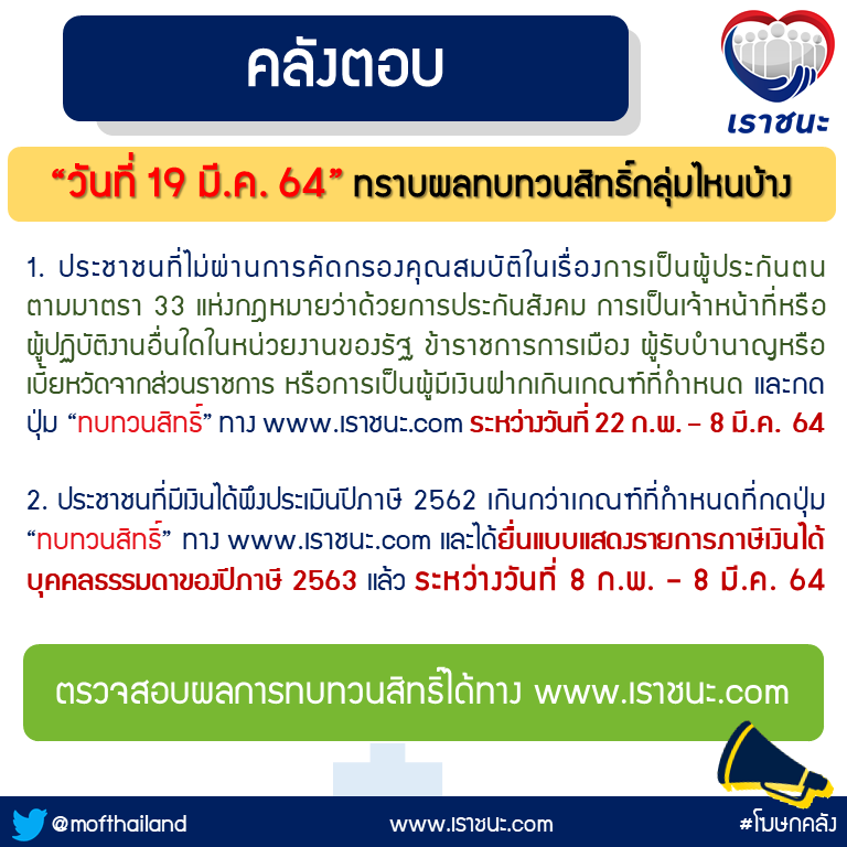 แถลงข่าว กค. ฉบับที่ 061/2564 เรื่อง การประกาศผลการทบทวนสิทธิ์รอบสอง