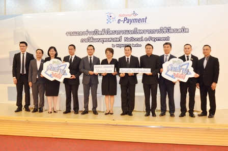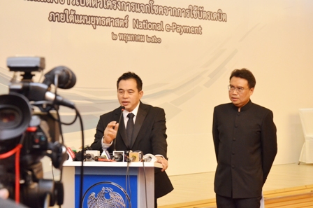 นายกฤษฎา จีนะวิจารณะ ผู้อำนวยการสำนักงานเศรษฐกิจการคลัง และนายพรชัย ฐีระเวช ที่ปรึกษาด้านเศรษฐกิจการเงิน ในฐานะอนุกรรมการและเลขานุการร่วม ในคณะอนุกรรมการขับเคลื่อนโครงการการให้ความรู้ และส่งเสริมการใช้ธุรกรรมอิเล็กทรอนิกส์ ร่วมแถลงโครงการแจกโชคจากการใช้บัตรเดบิต ภายใต้แผนยุทธศาสตร์ National e-Payment โดยมีปลัดกระทรวงการคลังเป็นประธาน