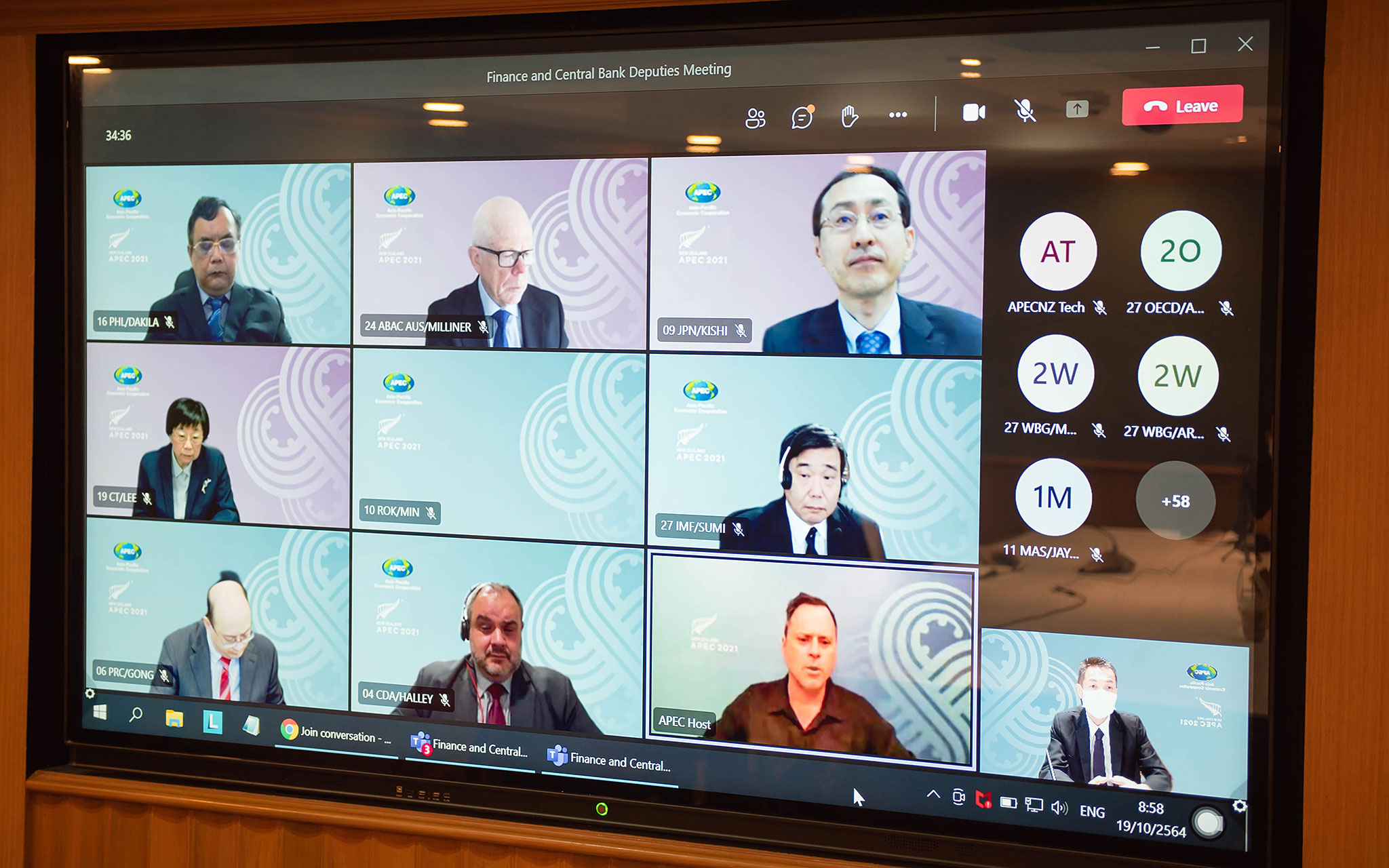 นายวุฒิพงศ์ จิตตั้งสกุล ที่ปรึกษาด้านเศรษฐกิจการคลัง เข้าร่วมการประชุมระดับปลัดกระทรวงการคลังและรองผู้ว่าการธนาคารกลางเอเปค (APEC Finance and Central Bank Deputies' Meeting: APEC FCBDM) ซึ่งมีกระทรวงการคลังนิวซีแลนด์เป็นเจ้าภาพ ผ่านการประชุมในรูปแบบสื่ออิเล็กทรอนิกส์ ณ ห้องประชุม 302 ชั้น 3 สำนักงานเศรษฐกิจการคลัง เมื่อวันที่ 19 ตุลาคม 2564