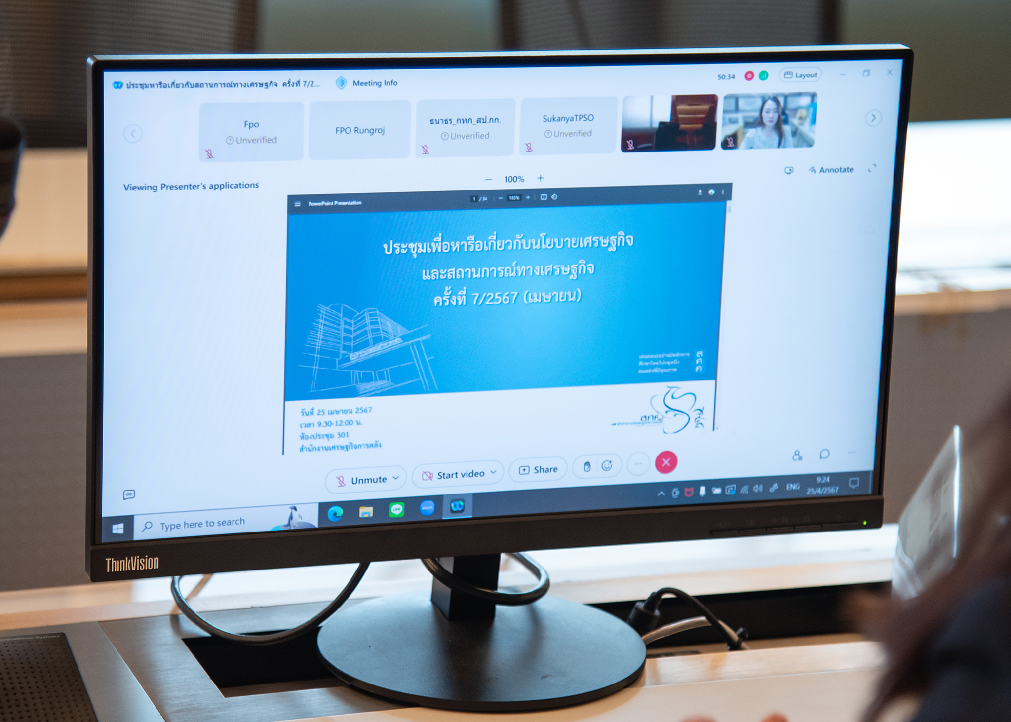 นายวโรทัย โกศลพิศิษฐ์กุล ที่ปรึกษาด้านเศรษฐกิจระหว่างประเทศ สำนักงานเศรษฐกิจการคลัง เป็นประธานการประชุมหารือเกี่ยวกับสถานการณ์ทางเศรษฐกิจ ครั้งที่ 7/2567 ผ่านสื่ออิเล็กทรอนิกส์ (Cisco Webex Meetings) ณ ห้องประชุม 301 ชั้น 3 สำนักงานเศรษฐกิจการคลัง เมื่อวันที่ 25 เมษายน 2567