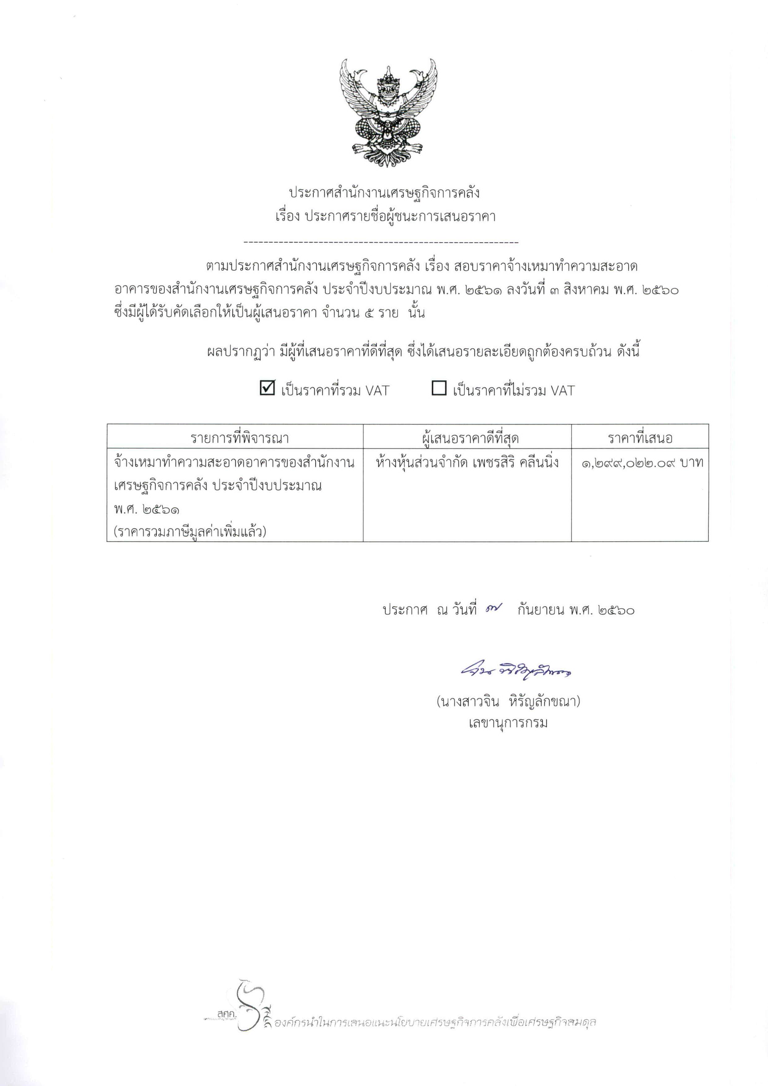 ประกาศสำนักงานเศรษฐกิจการคลัง เรื่อง ประกาศรายชื่อผู้ชนะการเสนอราคา สอบราคาจ้างเหมาทำความสะอาดอาคารของสำนักงานเศรษฐกิจการคลัง ประจำปีงบประมาณ พ.ศ. 2561 ลงวันที่ 3 สิงหาคม พ.ศ. 2560