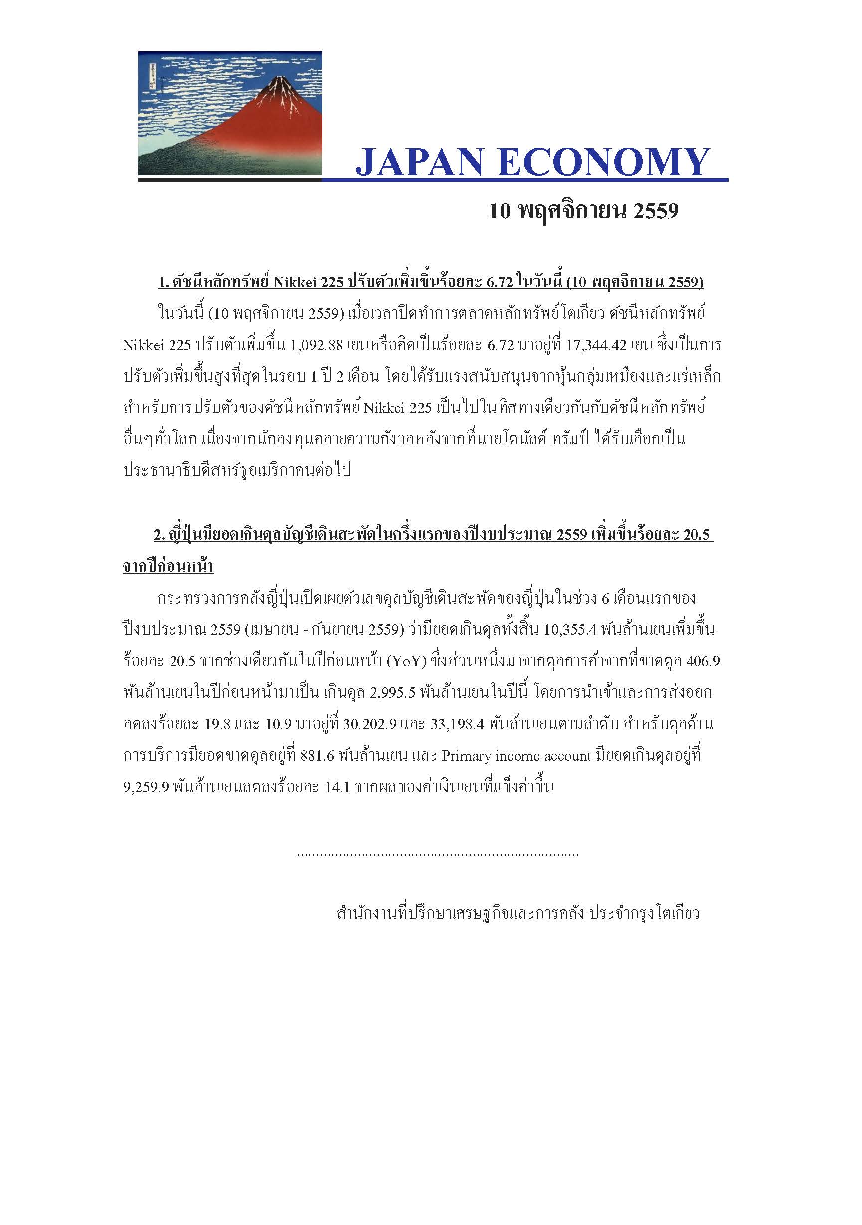รายงานภาวะเศรษฐกิจญี่ปุ่น ประจำวันที่ 10 พ.ย. 59