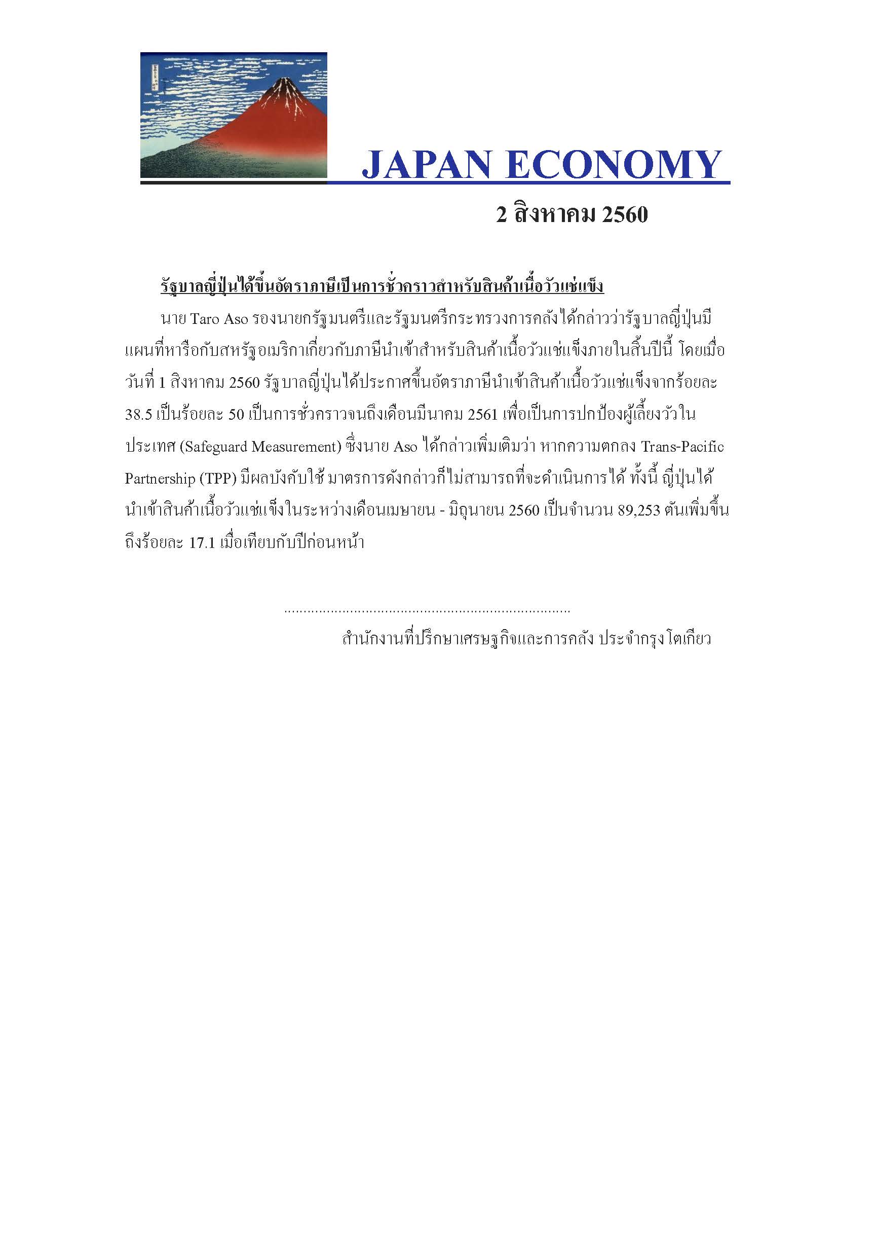 รายงานภาวะเศรษฐกิจญี่ปุ่น ประจำวันที่ 2 ส.ค. 60