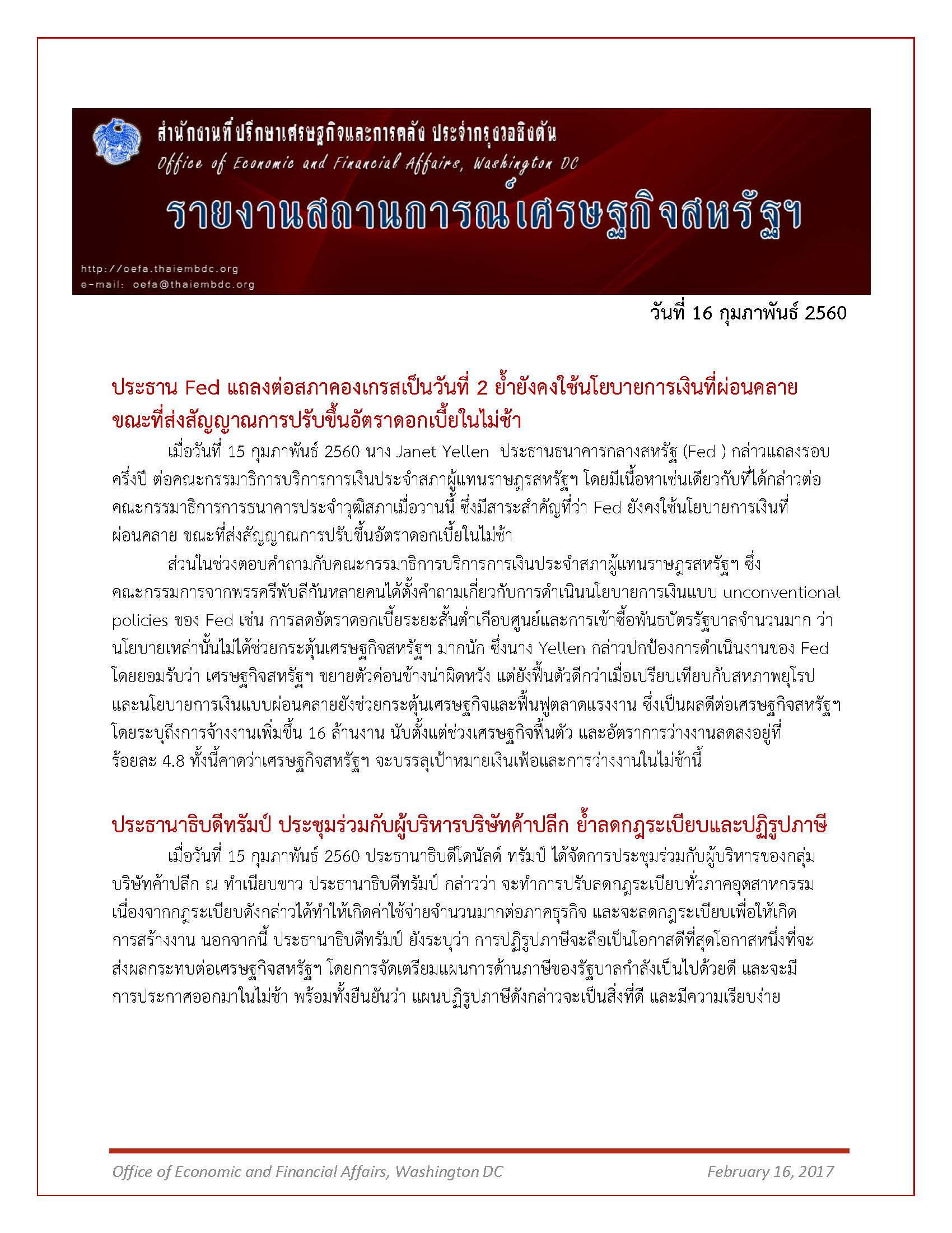 รายงานสถานการณ์เศรษฐกิจสหรัฐฯ ประจำวันที่ 16 ก.พ. 60