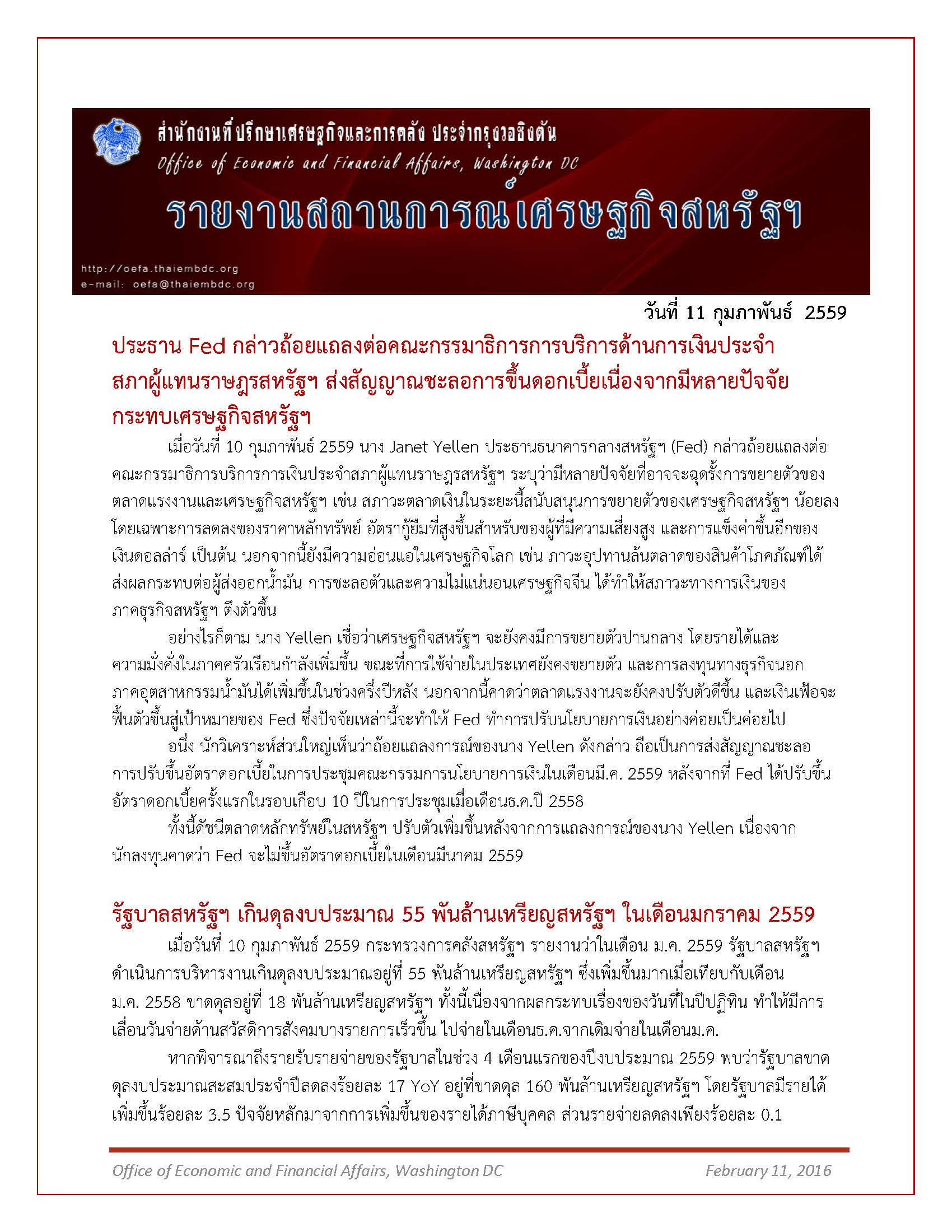 รายงานสถานการณ์เศรษฐกิจสหรัฐฯ ประจำวันที่ 11 ก.พ. 59