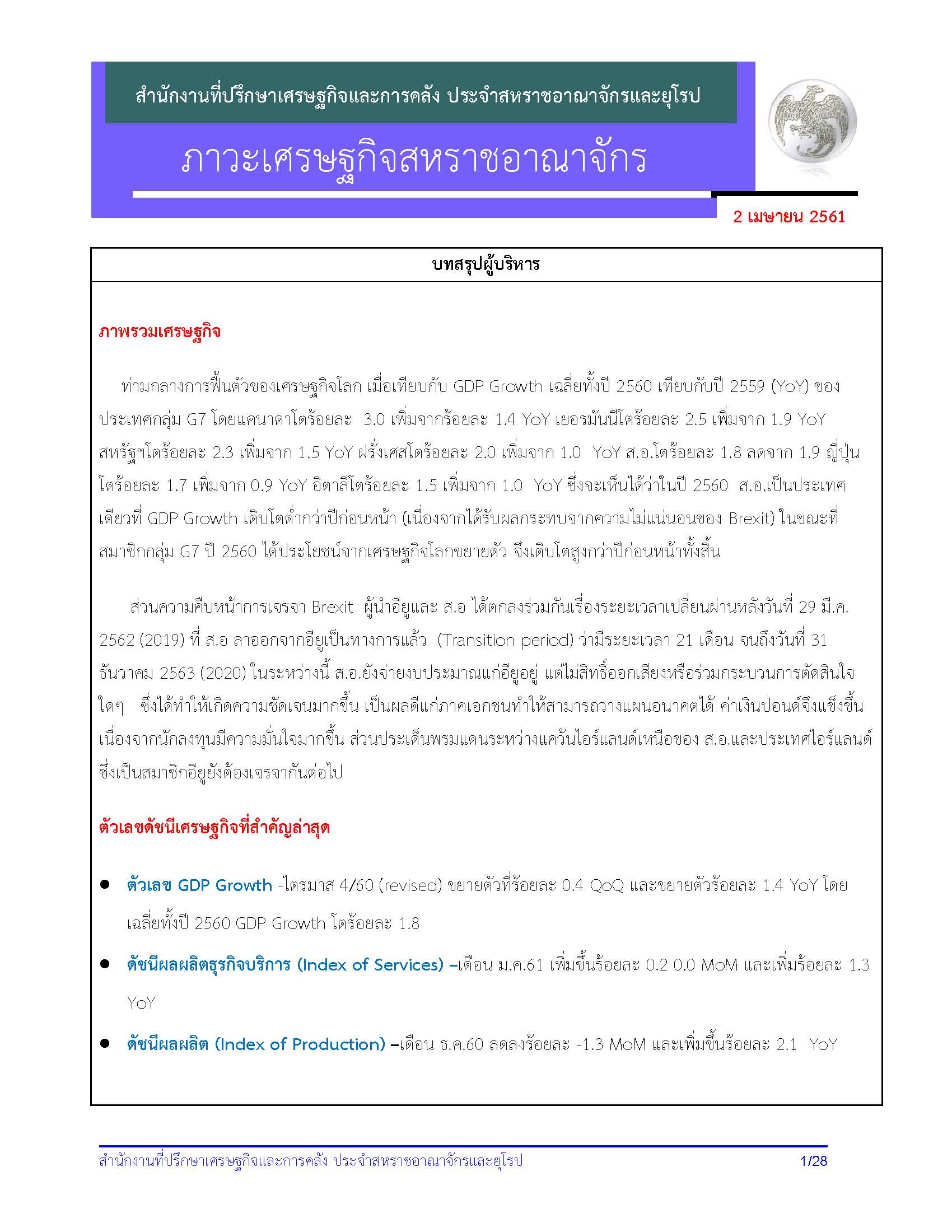 รายงานภาวะเศรษฐกิจสหราชอาณาจักรประจำเดือนมีนาคม 2561