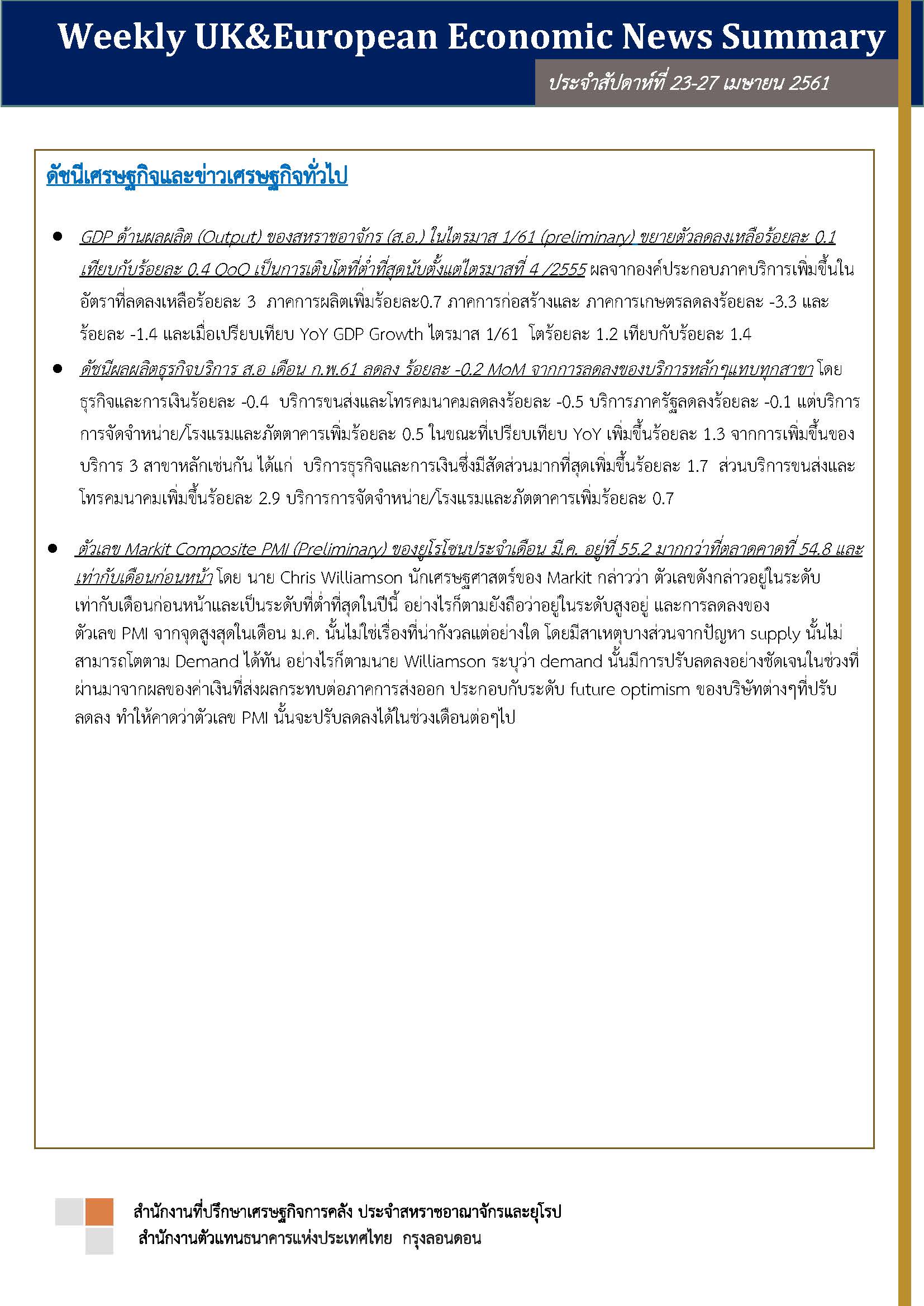 รายงานภาวะเศรษฐกิจประจำสหราชอาณาจักรและยุโรปประจำสัปดาห์ที่ 23-27เมษายน 2561