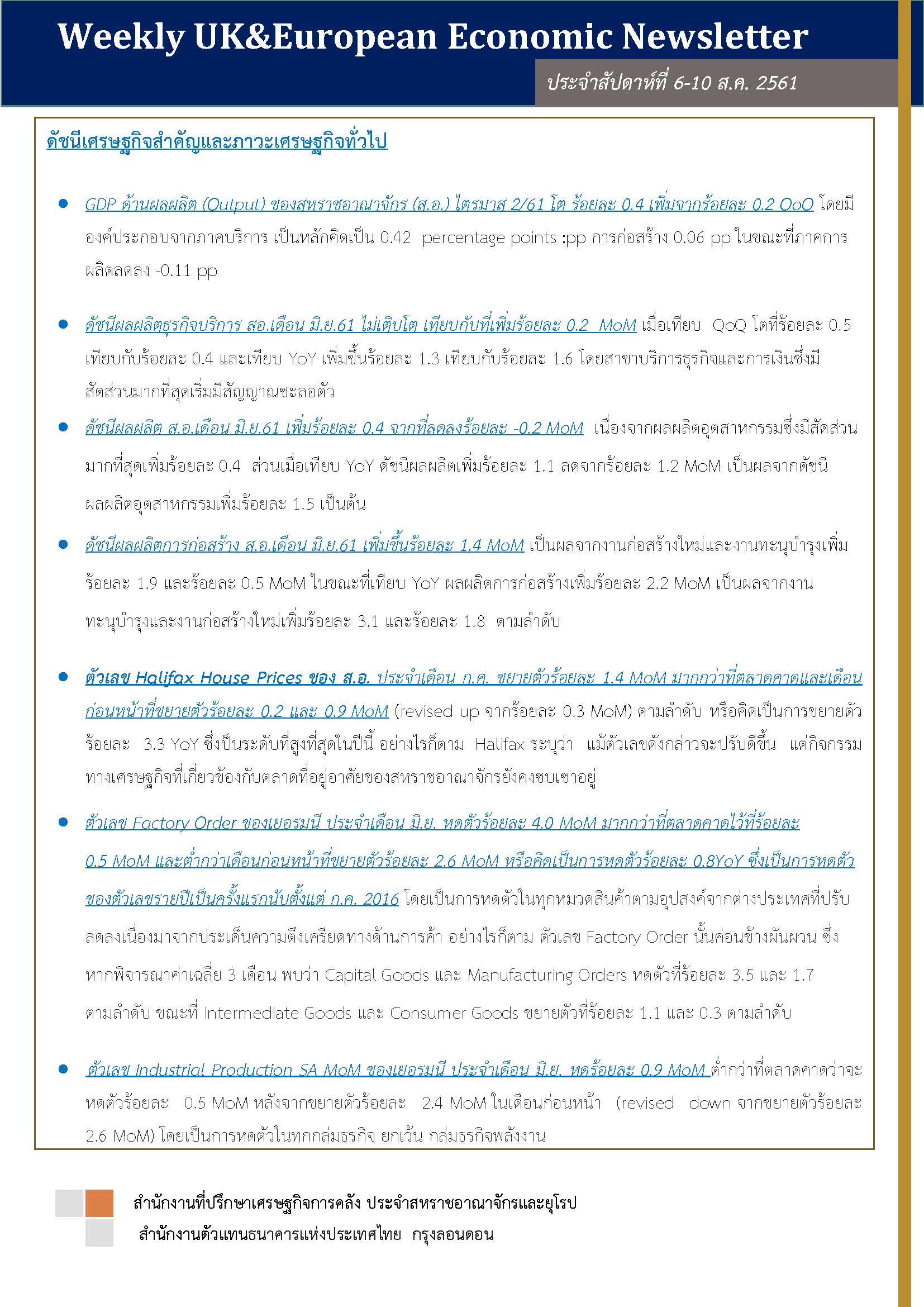 รายงานภาวะเศรษฐกิจสหราชอาณาจักรและยุโรป ประจำสัปดาห์ที่ 6-10 สิงหาคม 2561